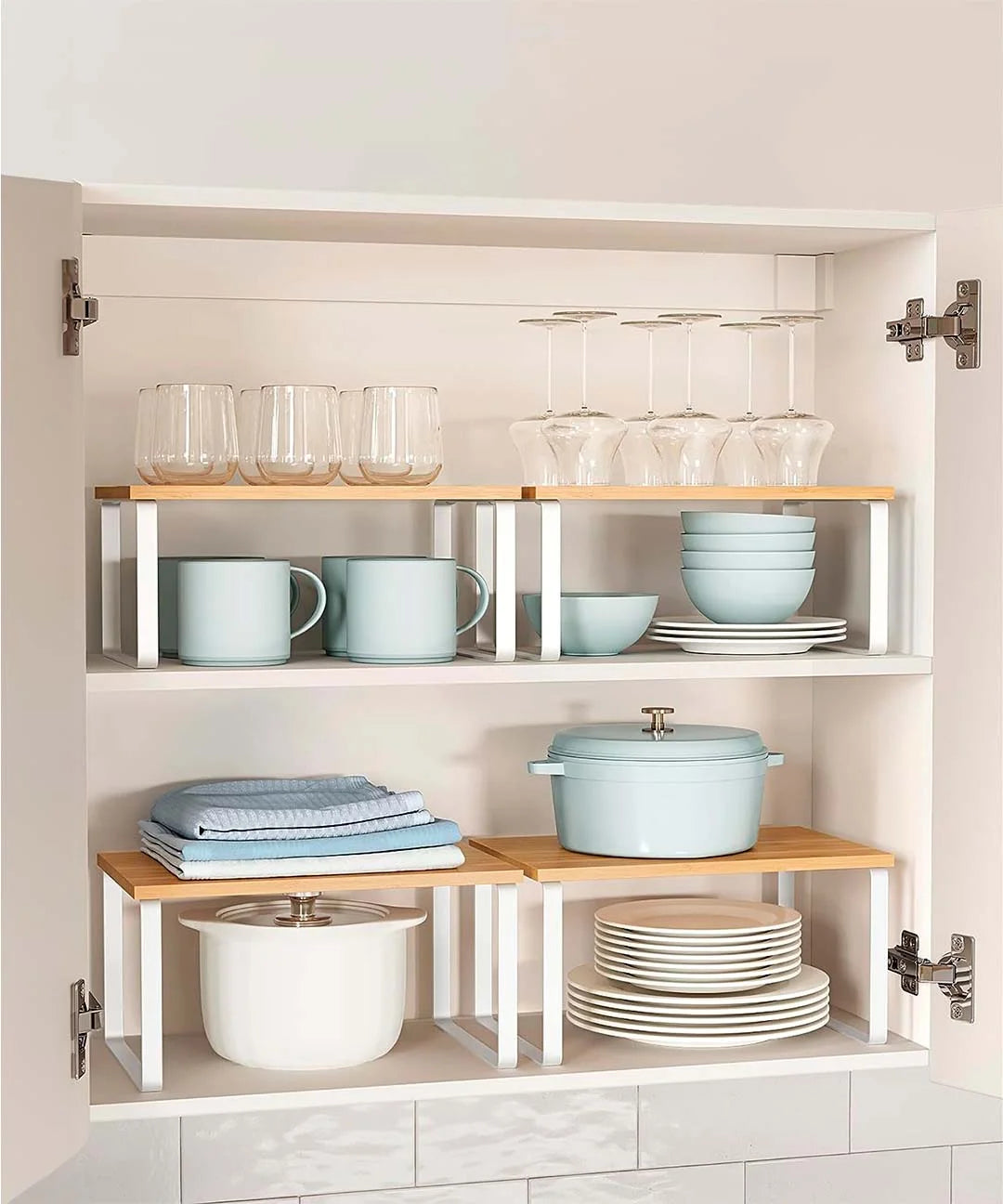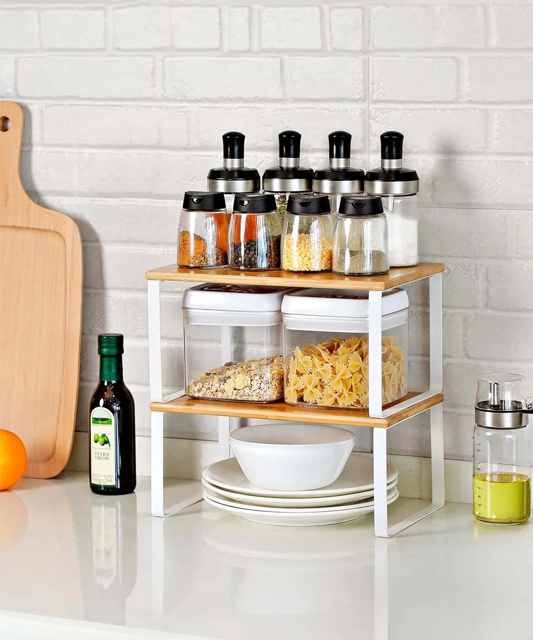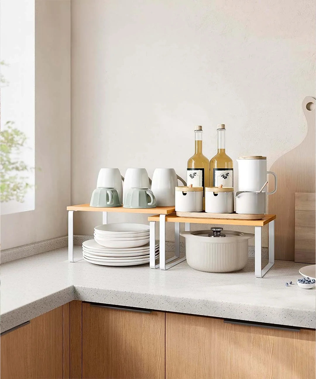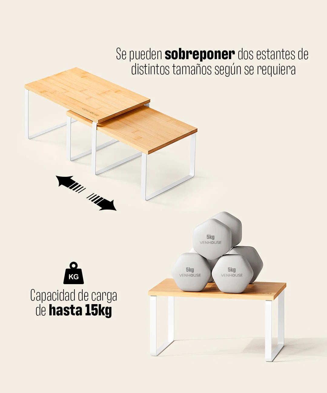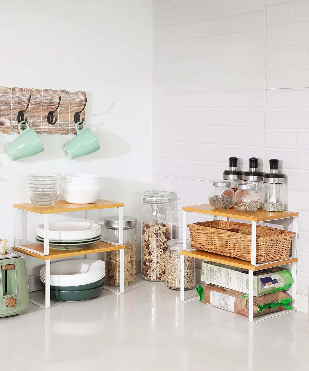 Ajustable: Con su diseño único, con uno ligeramente más pequeño que el otro, estos organizadores de estantes pueden apilarse uno encima del otro, anidarse, usarse por separado o incluso en forma de L. Ajusta cómo desees para adaptarse perfectamente al espacio de tu cocina.